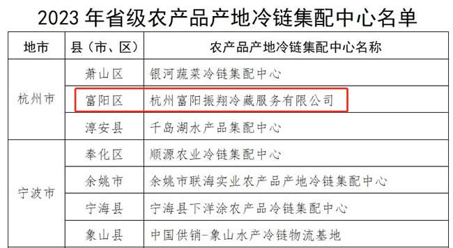 近日,浙江省農業農村廳發布關于公布2023年省級農產品產地冷鏈集配中心認定結果的通知,杭州富陽振翔冷藏服務有限公司冷庫被認定為“省級農產品產地冷鏈集配中心”。